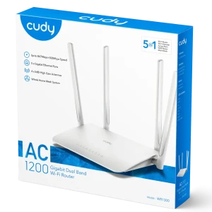 A dual-band AC1200 WiFi router ideal for smooth 4K playback, gaming, a connecting to a max 1000 Mbps internet access, featuring Cudy Mesh, app control, VPN, and MU-MIMO.