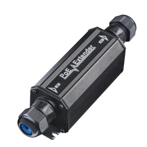 A weather-proof PoE extender that extends the PoE distance by 100m.